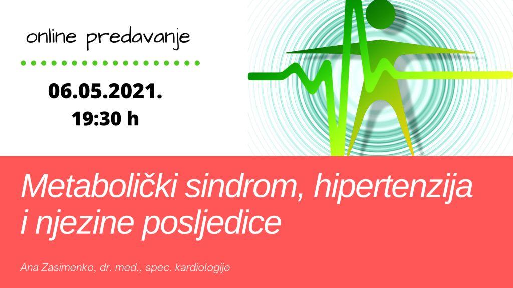 Pozivamo sve zainteresirane zdravstvene djelatnike na online predavanje pod nazivom „Metabolički sindrom, hipertenzija i njezine posljedice‟, koje će održati dr. med. Ana Zasimenko, specijalist kardiologije.